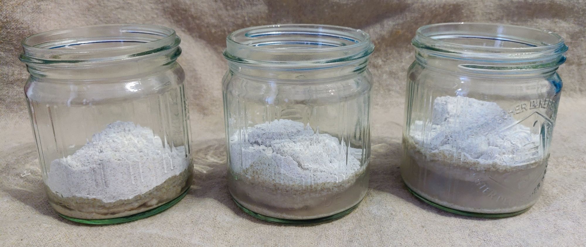 Mir ging es also darum welchen Einfluss die Flüssigkeitsmenge auf den Geschmack hat. Dazu habe ich drei mal aufgefrischt (jeweils mit Roggenvollkornmehl von der Adlermühle):